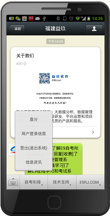 系统包括资讯网站、管理系统、手机端三个子系统组成。业务系统功能模块组包括学籍管理、基础数据、考试管理、学生平台、成绩管理、网站管理、系统安全控制、查询统计和系统设置等。在微信软件中扫描二维码图片,或查找并关注微信公众账号“福建益玖”,获取最新信息资讯,使用分数查询、问题反馈等服务。